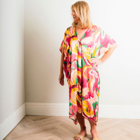Fuchsia Multi Print Silky Soft Midi Length Kaftan Day and Beach Dress.