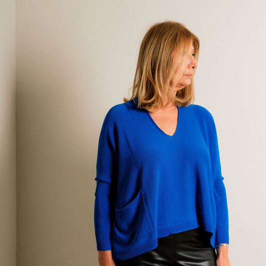 Cobalt Blue Structured Knit Double Pocket V Neck Easy Wear Top