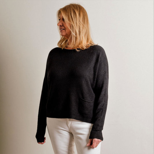 Black Double Pocket Supersoft Fine Knit Round Neck Easy Wear Jumper