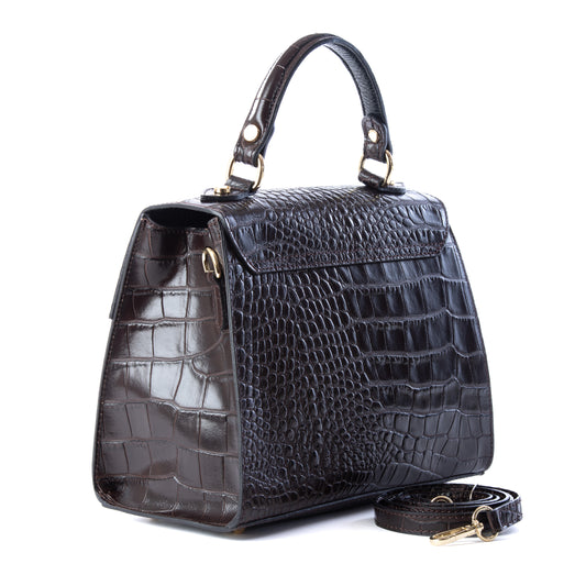 Dark Chocolate Brown Italian Leather Croc Satchel Tote Bag